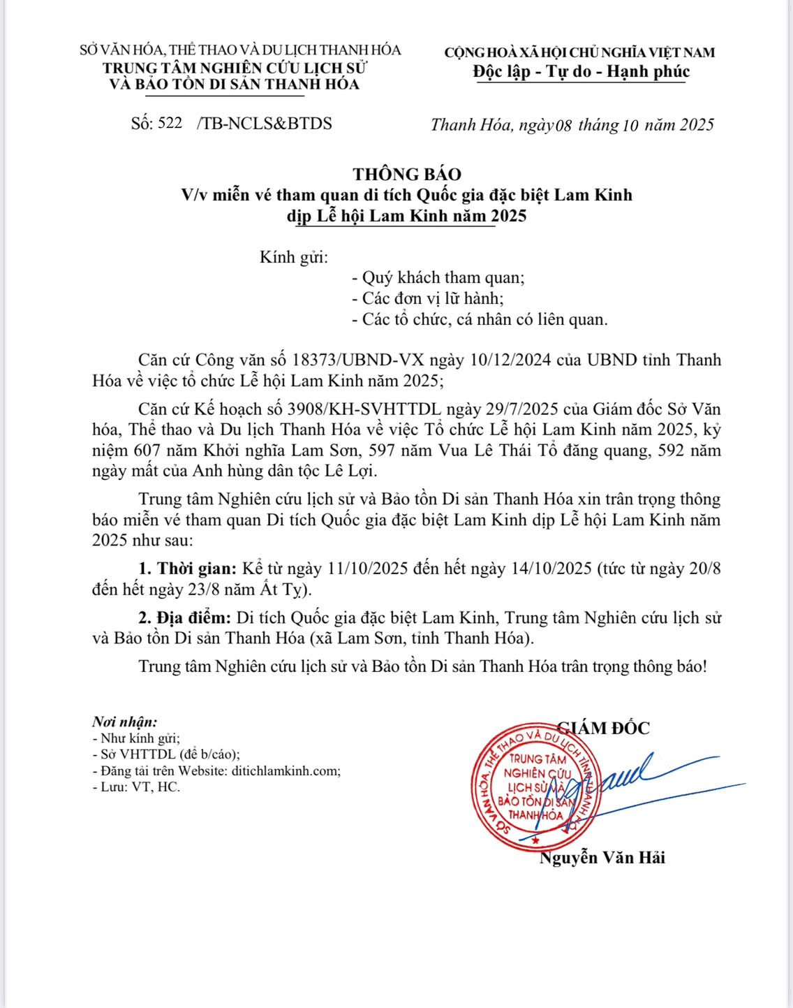 THÔNG BÁO V/v miễn vé tham quan di tích Quốc gia đặc biệt Lam Kinh dịp Lễ hội Lam Kinh năm 2025